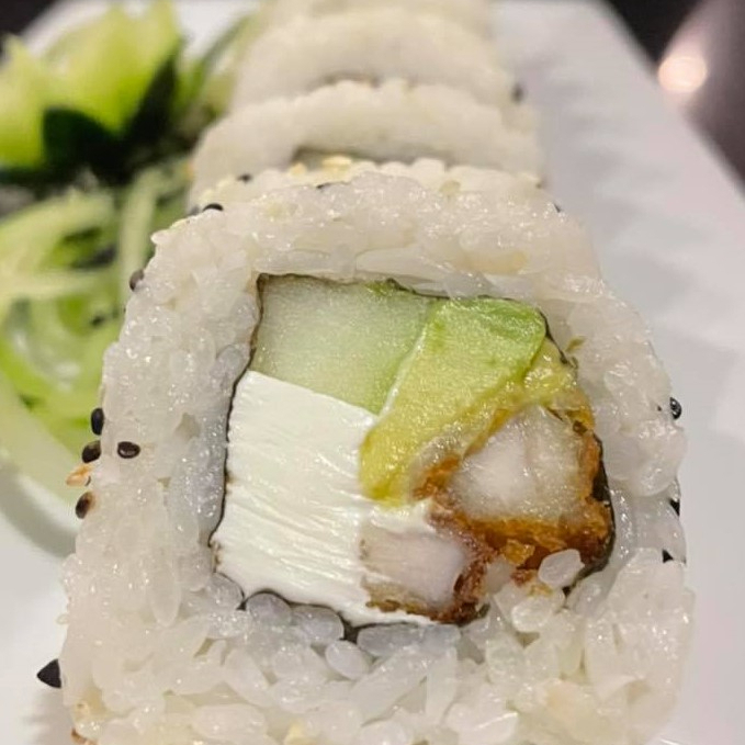 Por fuera aguacate, tampico, picante oriental y camarón empanizado.Por dentro surimi, pepino y philadelphia.