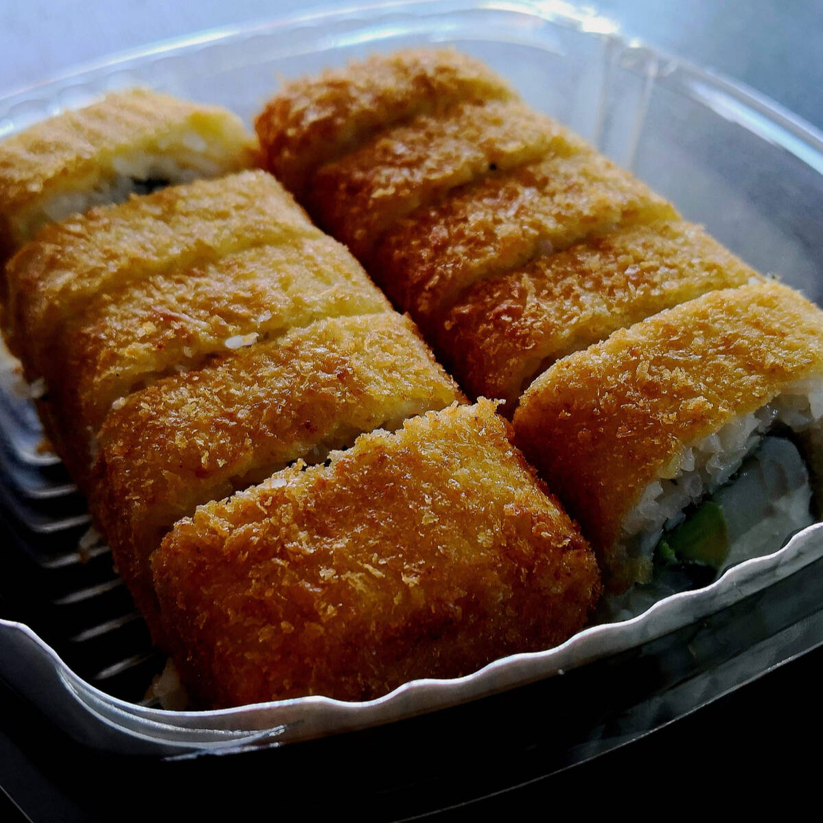 Por Fuera : rollo empanizado y camarones roca Por Dentro : Camarón empanizado, aguacate y philadelphia.
