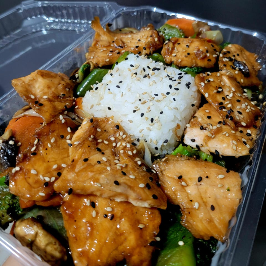 Verduras salteadas con salsa teriyaki acompañado de una pequeña porción de arroz y ajonjoli.