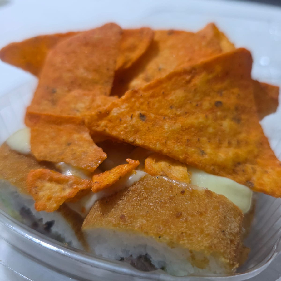 POR FUERA: empanizado, doritos y queso gratinado, POR DENTRO: arrachera, aguacate y chile jalapeño.