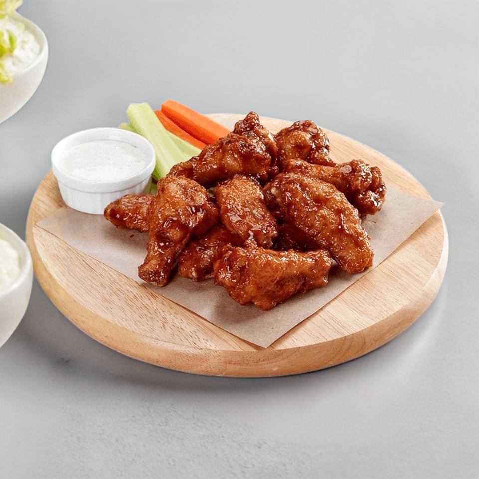 8 deliciosas piezas de alitas fritas sabor a elegir, BBQ, BUFALO, PICANTE, MANGO HABANERO, RANCH HABANERO, PIMIENTA LIMON Y NATURAL , acompañado de apio zanahoria y salsa ranch.