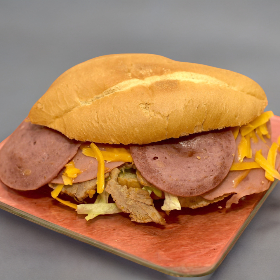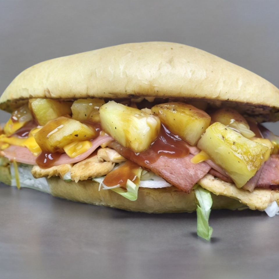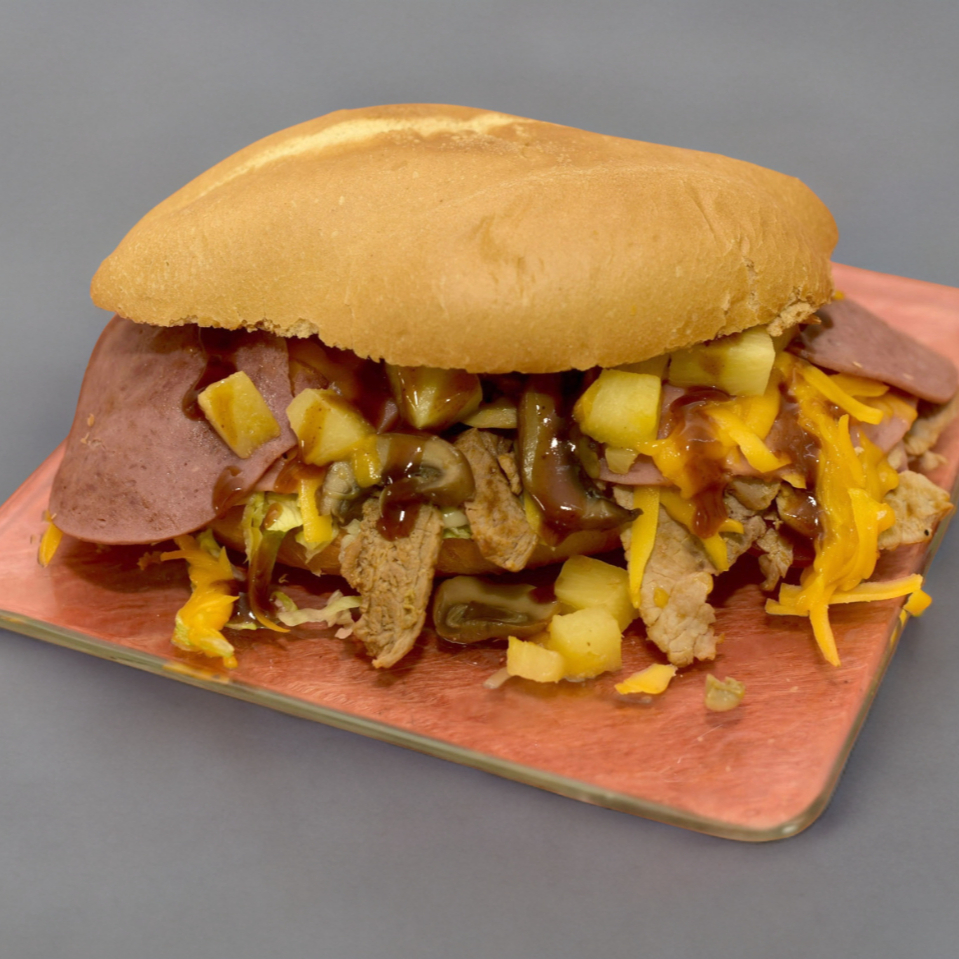 Pierna horneada, jamón, salami, trocitos de pina, champiñones, queso americano , lechuga romana, mayonesa y acompañada de salsa BBQ.