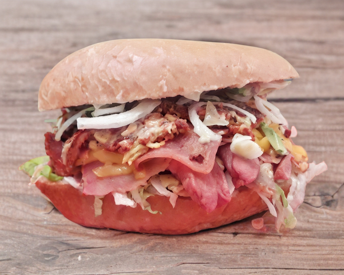 100 Gr. de carne de res, jamón, tocino, queso americano, lechuga romana, jitomate, champiñones, mayonesa, cátsup y mostaza.
