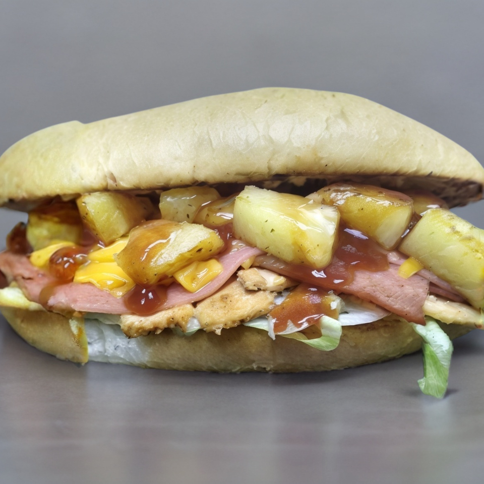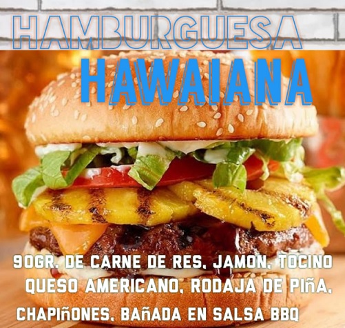 Carne de res 100% rodaja de piña a la plancha, jamón , tocino, champiñones y queso americano + lechuga romana, jitomate, mayonesa y acompañada de salsa BBQ.