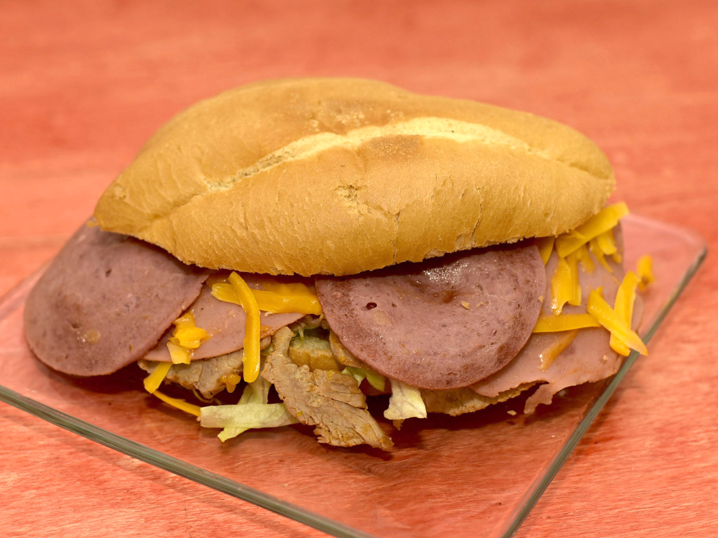 Pierna horneada, jamón, salami, queso americano gratinado, lechuga romana , tomate y mayonesa.
