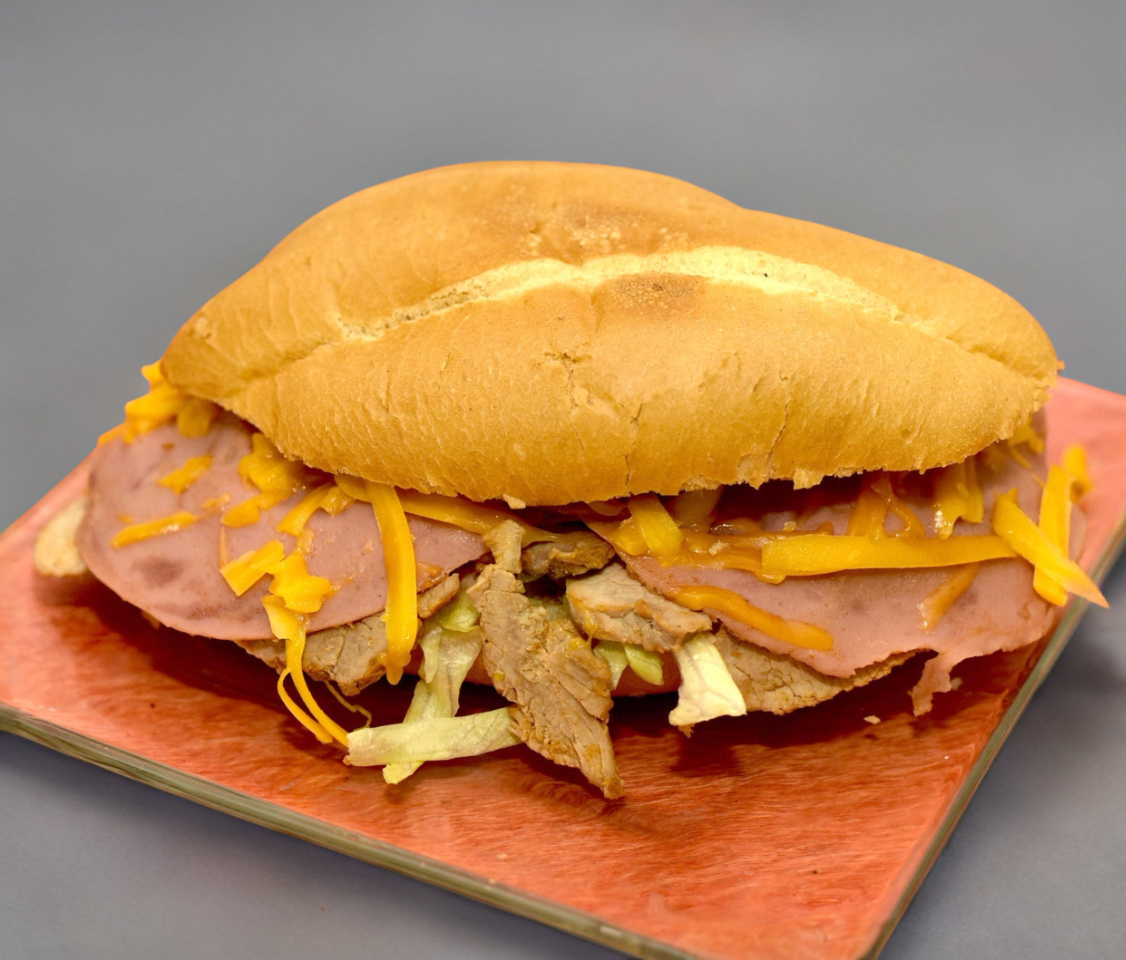 Pierna horneada, jamón, queso americano, lechuga romana, tomate y mayonesa.