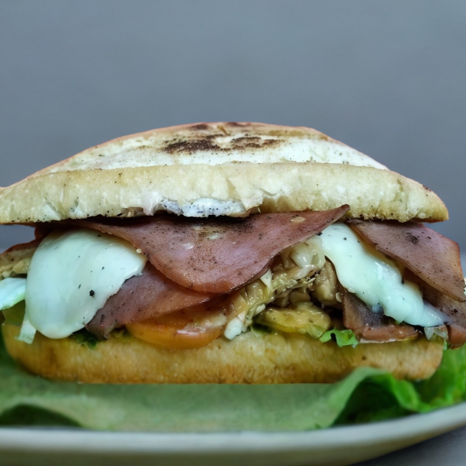 Pierna horneada, jamón, tocino, cebollita asada , aguacate, + lechuga romana, tomate y mayonesa.