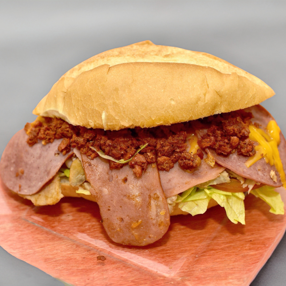 (Platillo personal) Pierna horneada , jamón, salami, tocino, queso americano, chorizo italiano, lechuga romana, tomate, mayonesa, acompañada de salsa BBQ. (200gr a 250gr)