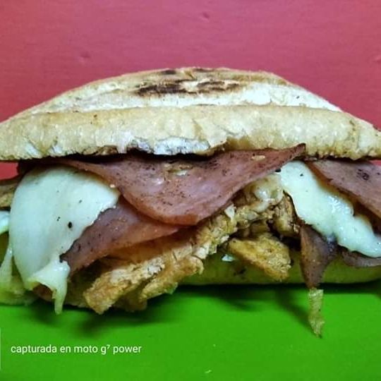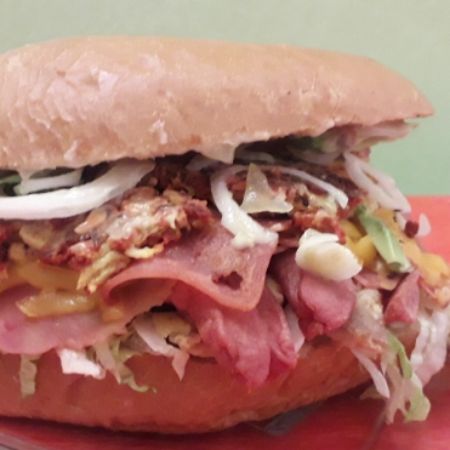 Pierna horneada, jamón, tocino, queso manchego y cebolla asada aderezada con salsa guacamole habanero, + romanita, tomate y mayonesa.