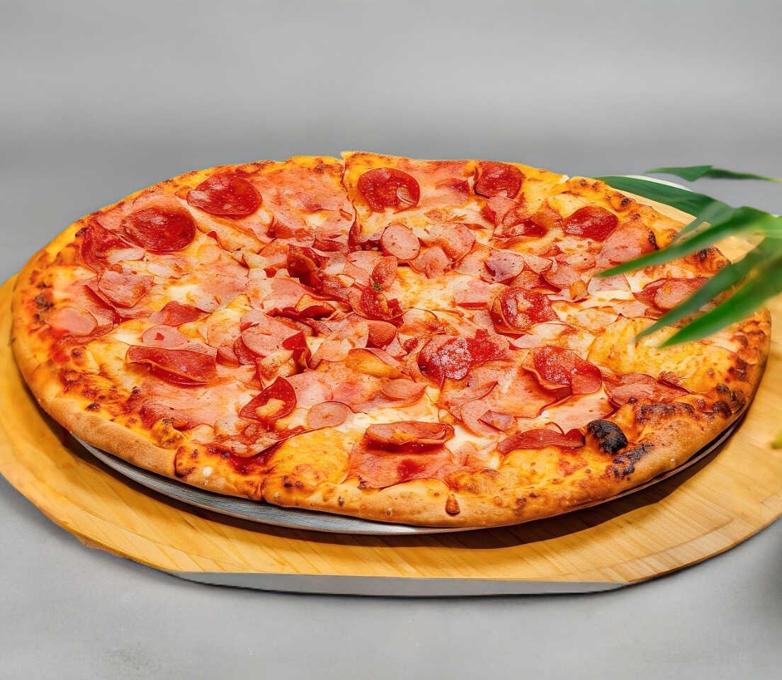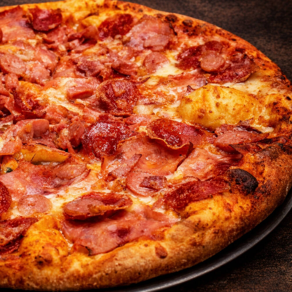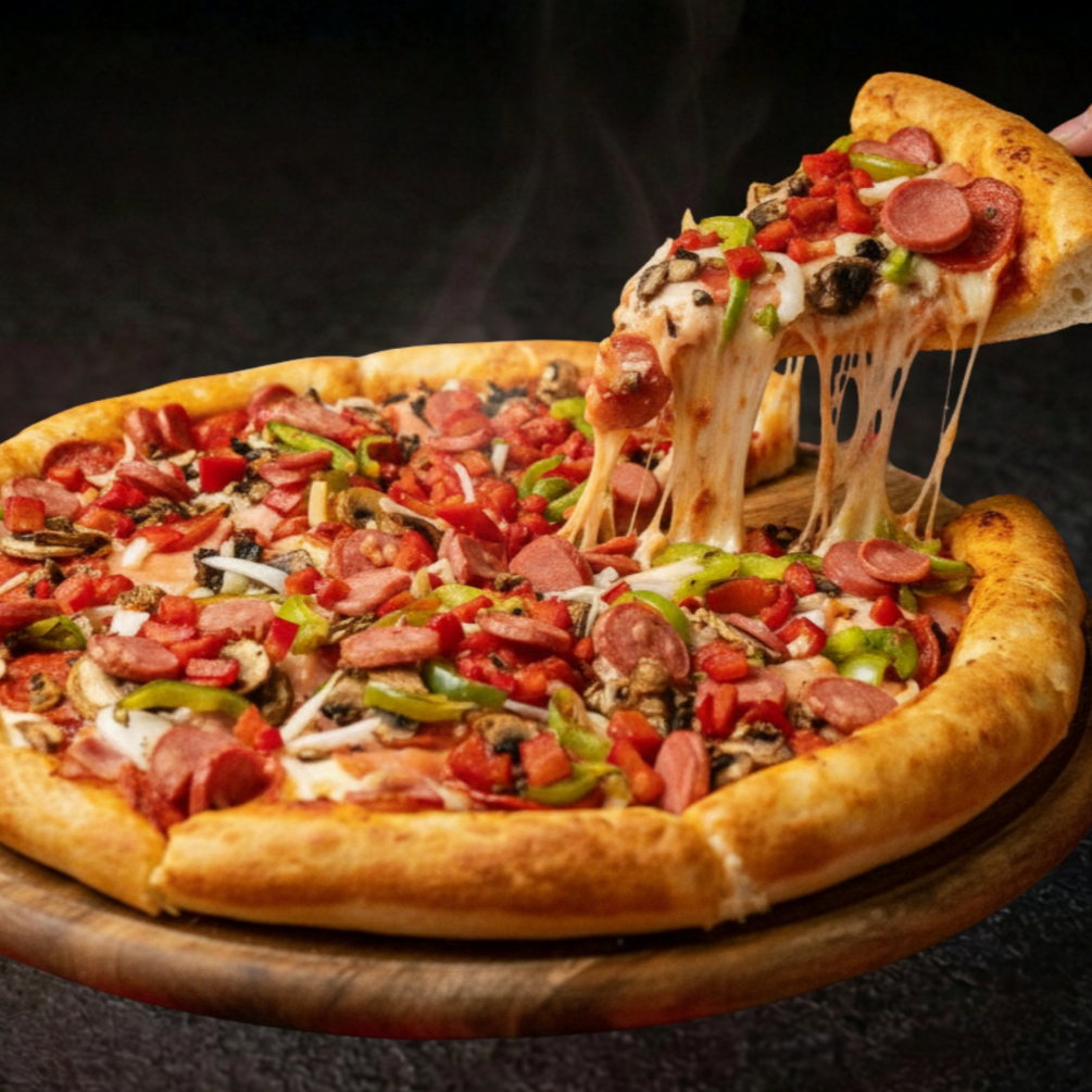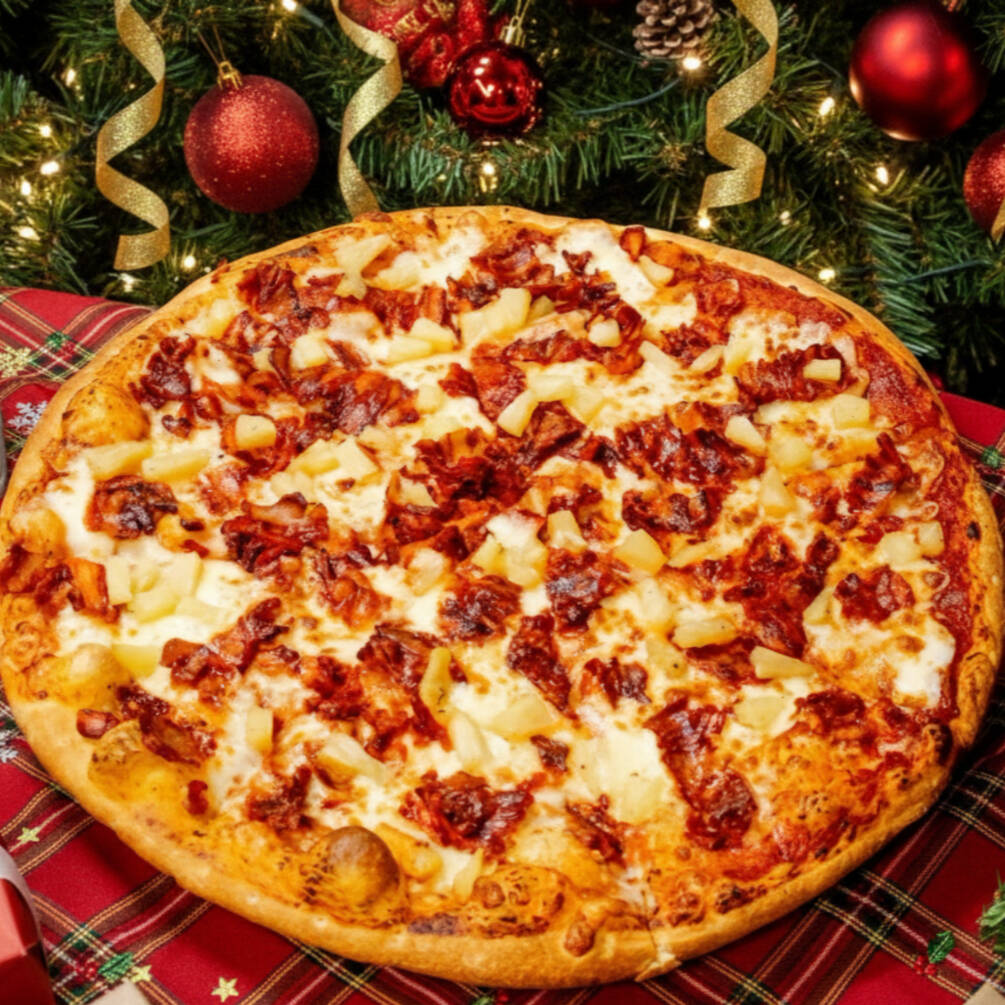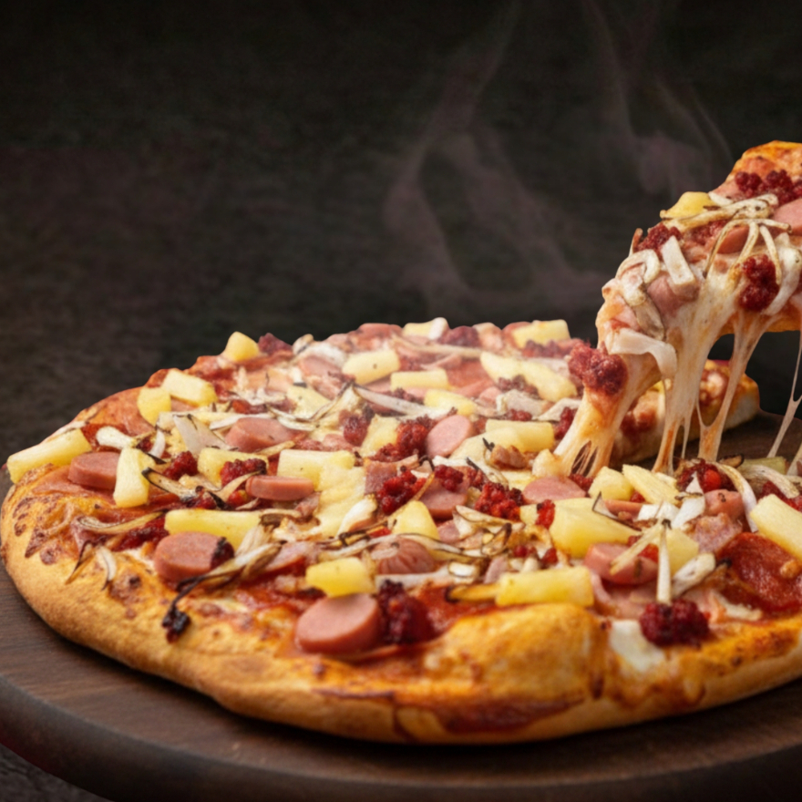 Pizza tamaño grande de 8 rebanadas, base tomate y queso, ingredientes: Pepperoni, Jamón, Salchicha, Tocino, Chorizo, Cebolla y Piña