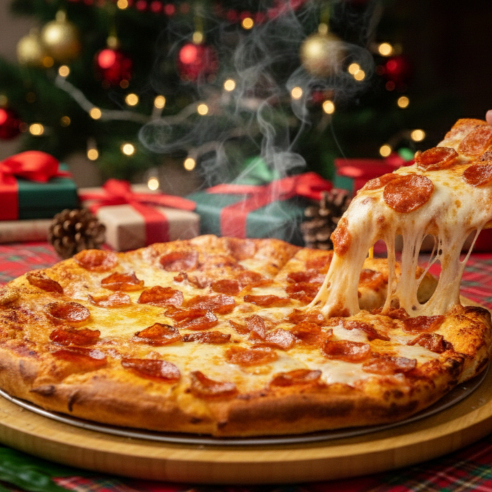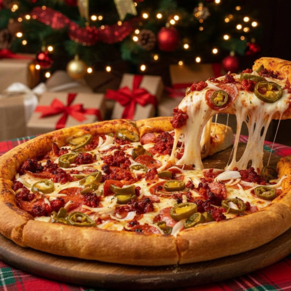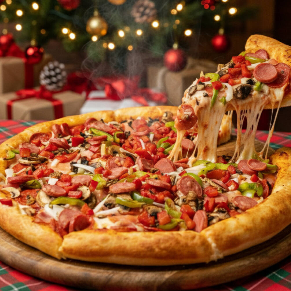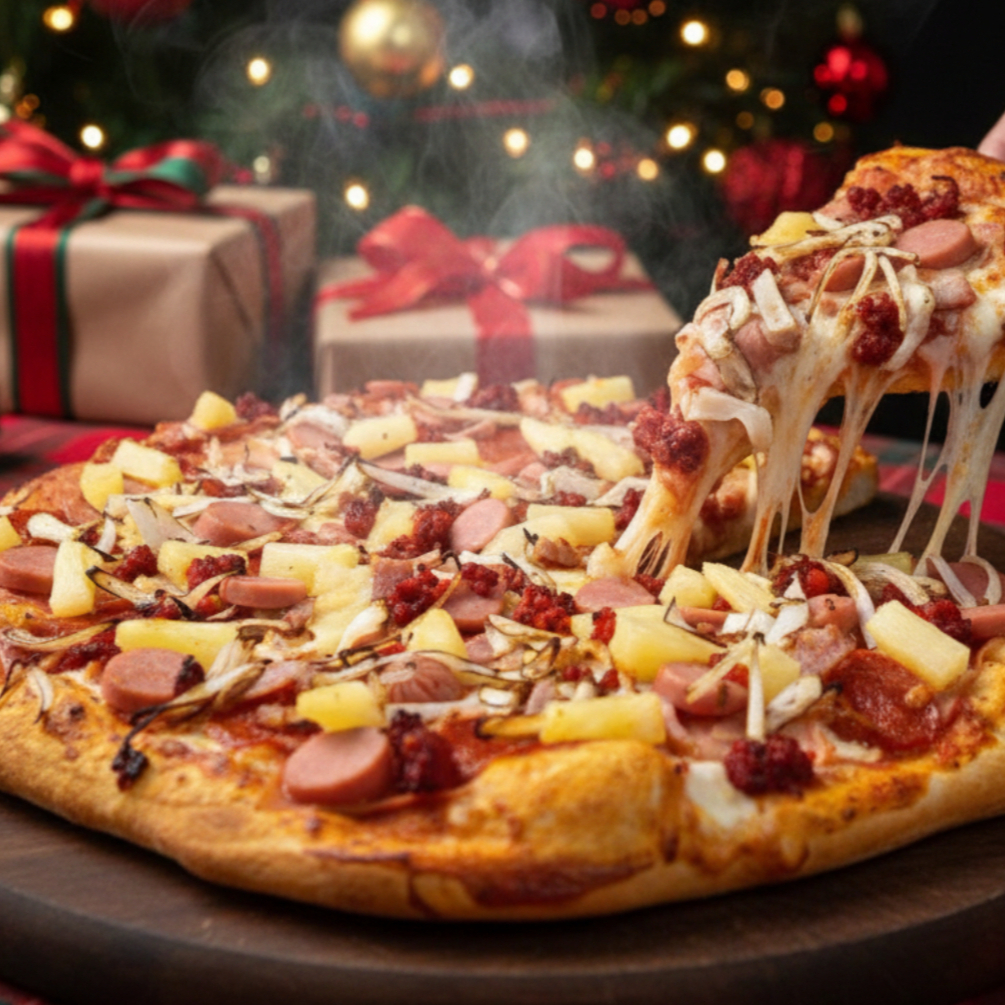 Pizza tamaño grande de 8 rebanadas, base tomate y queso, ingredientes: Pepperoni, Jamón, Salchicha, Tocino, Chorizo, Cebolla y Piña