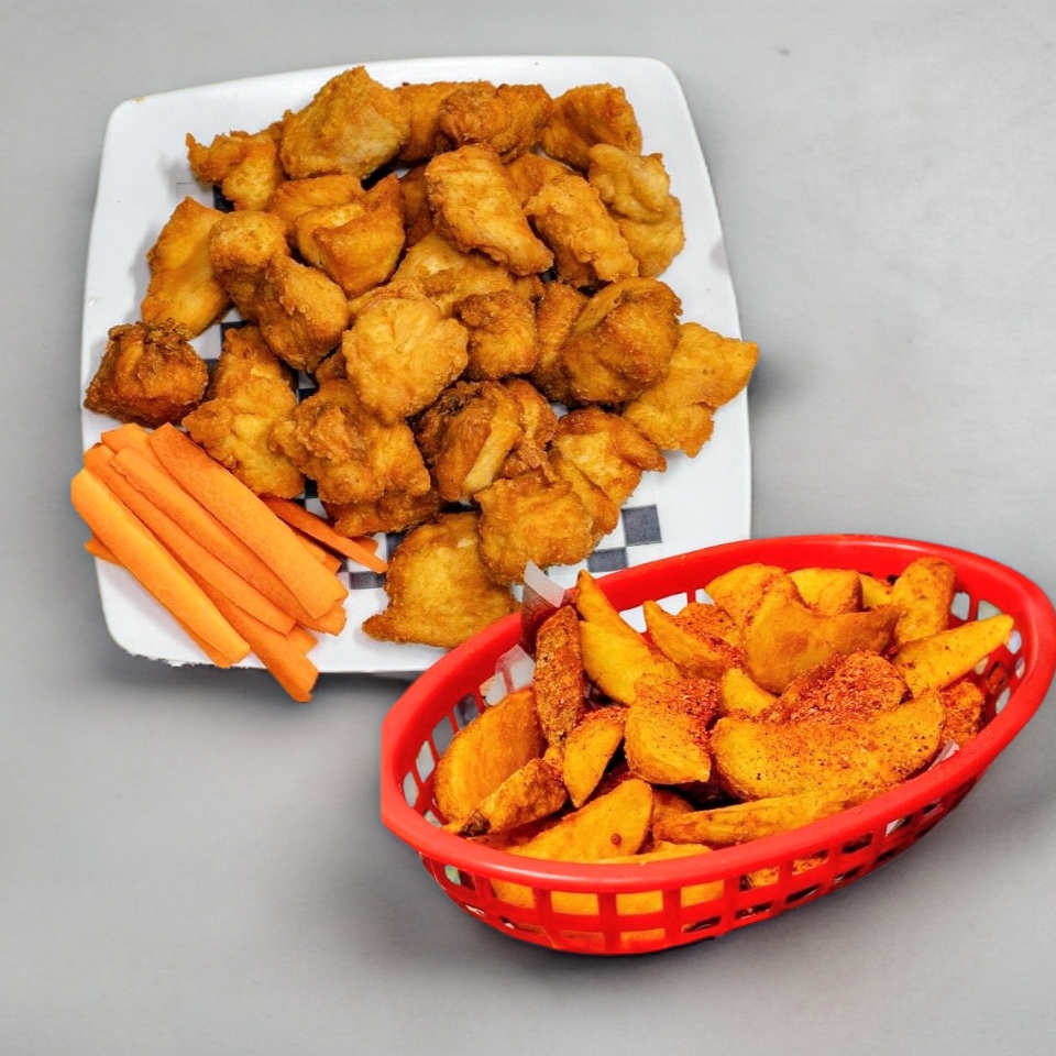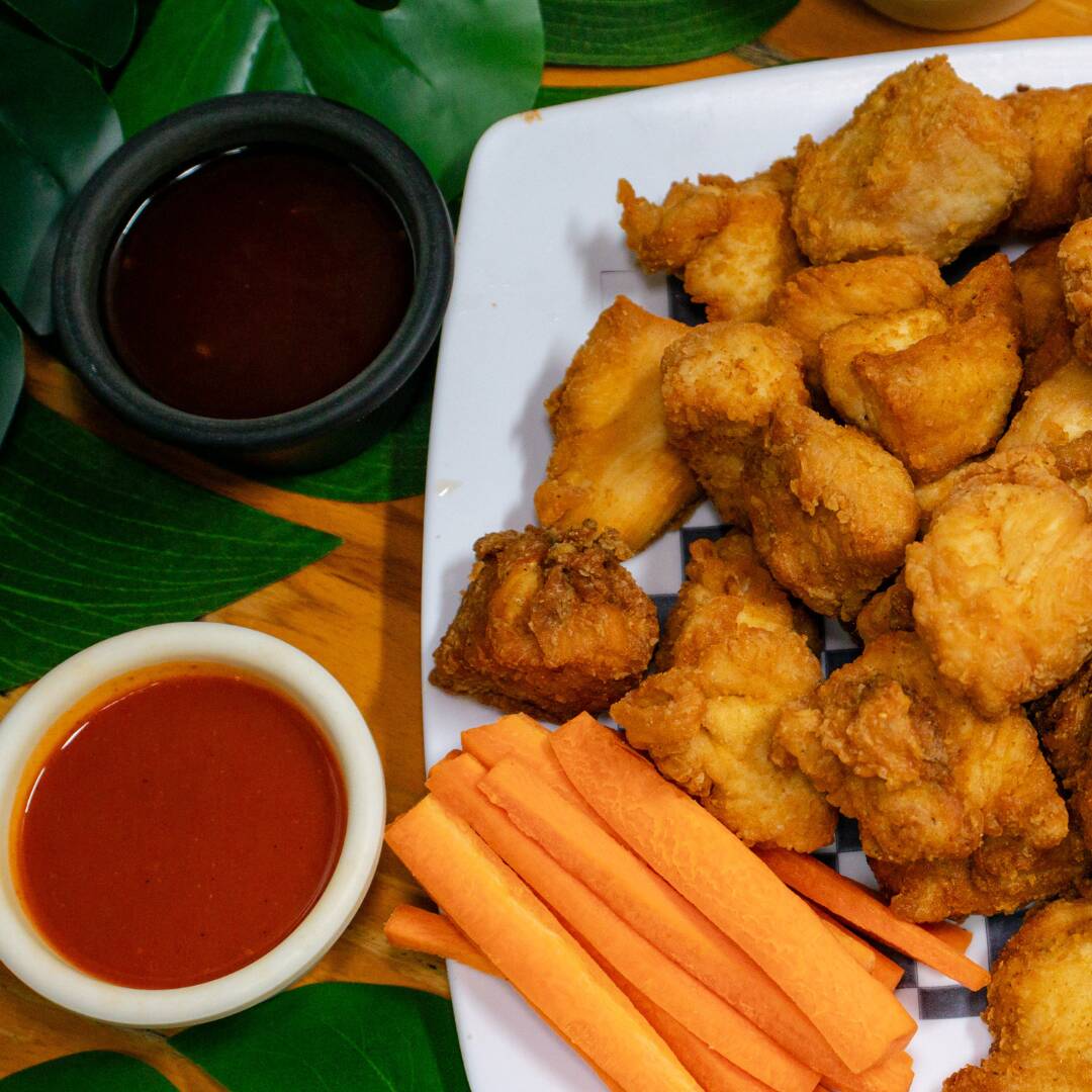 Trocitos de pechuga de pollo fritos y empanizados. Aproximadamente 30 piezas de boneless bañadas de tu salsa favorita