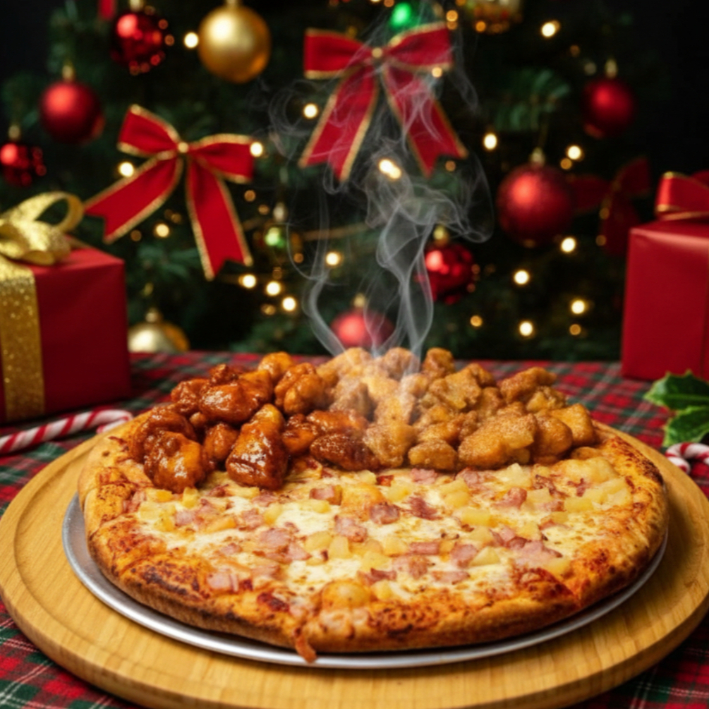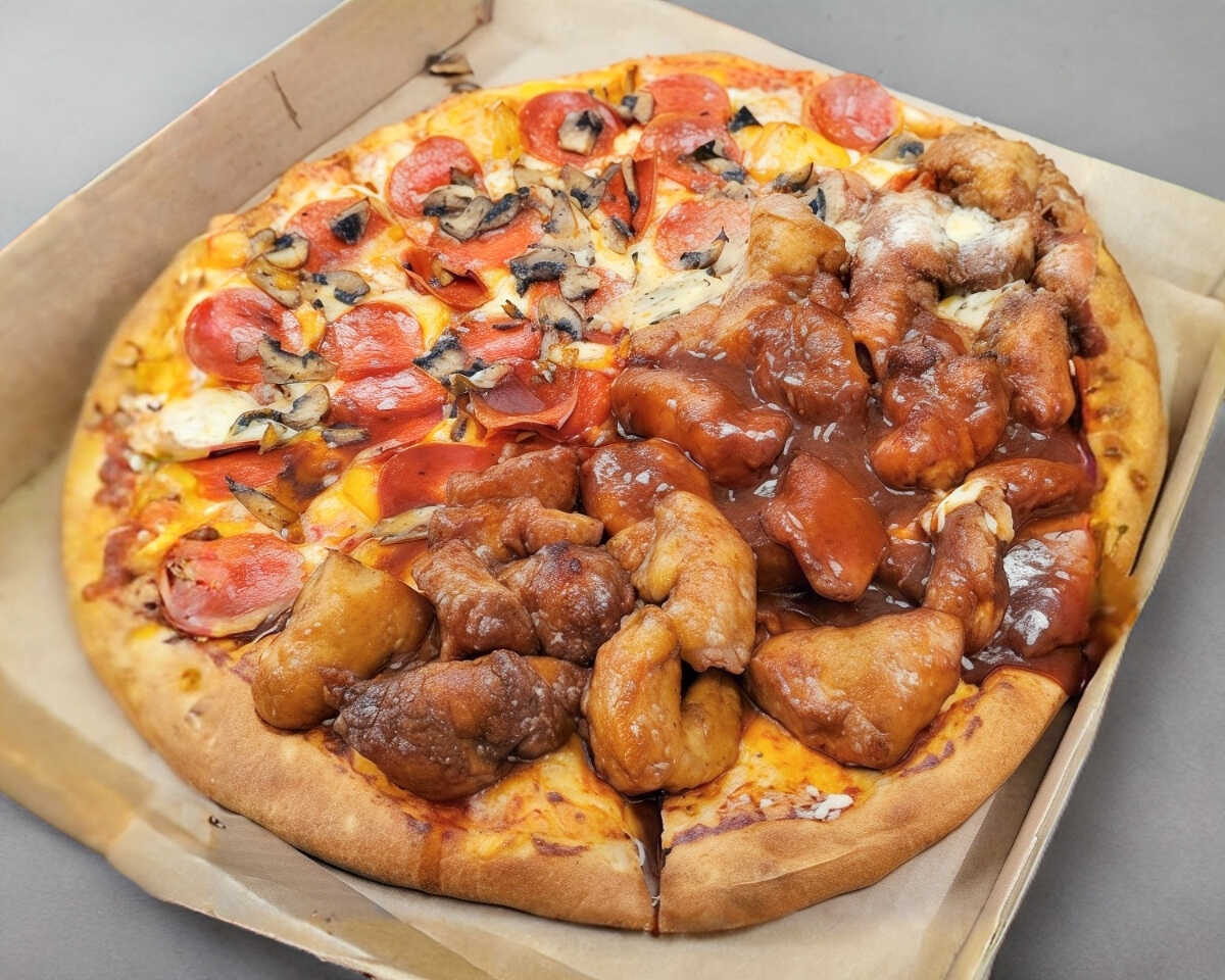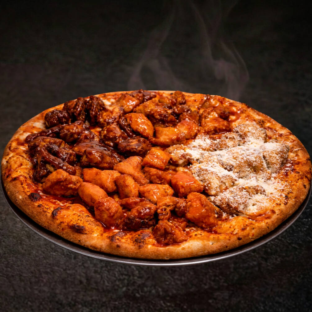 Pizza mitad de 2 ingredientes, mitad con 750 gr de boneless
