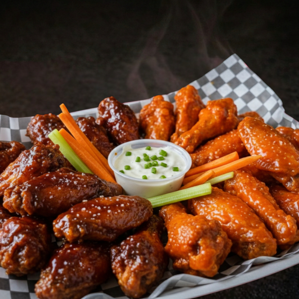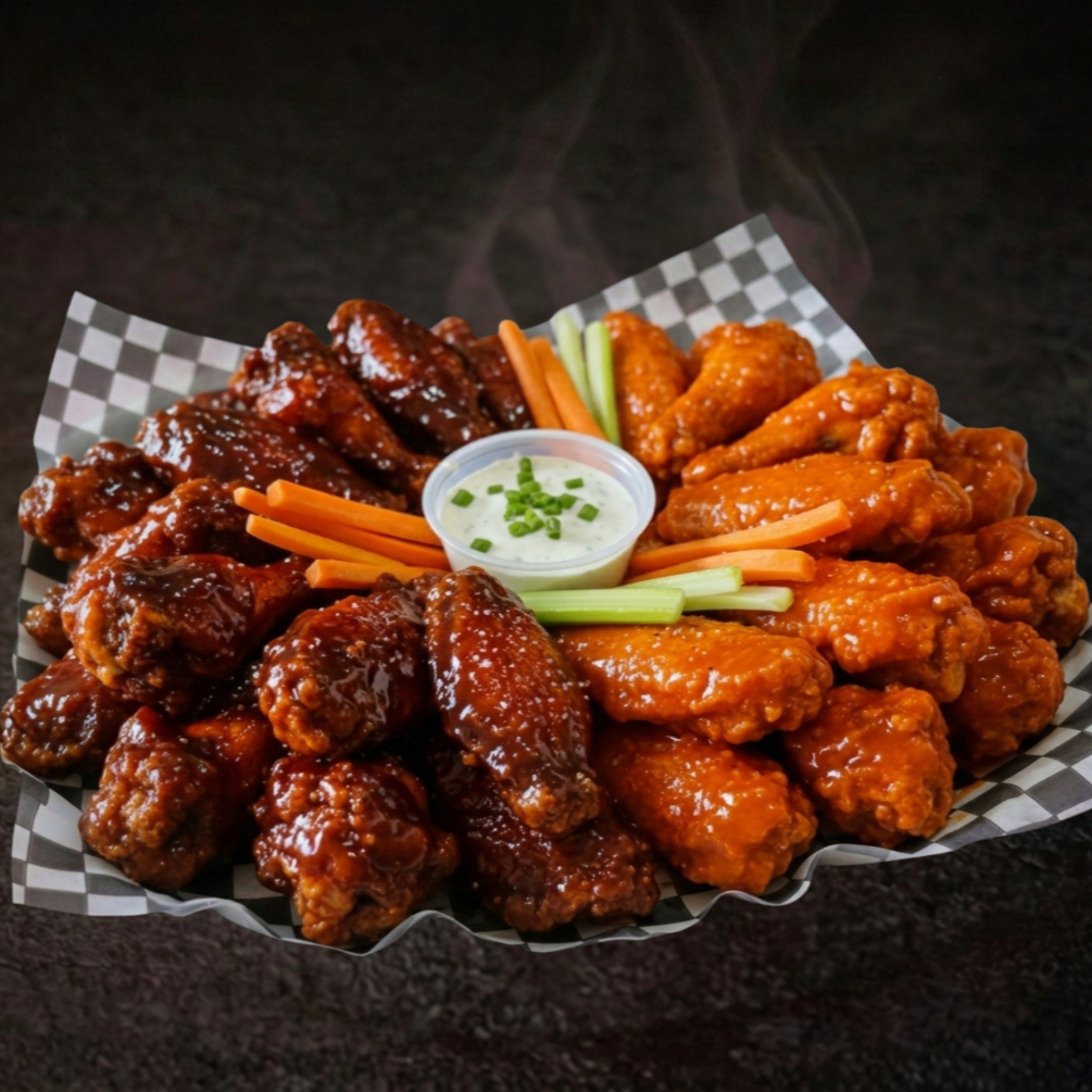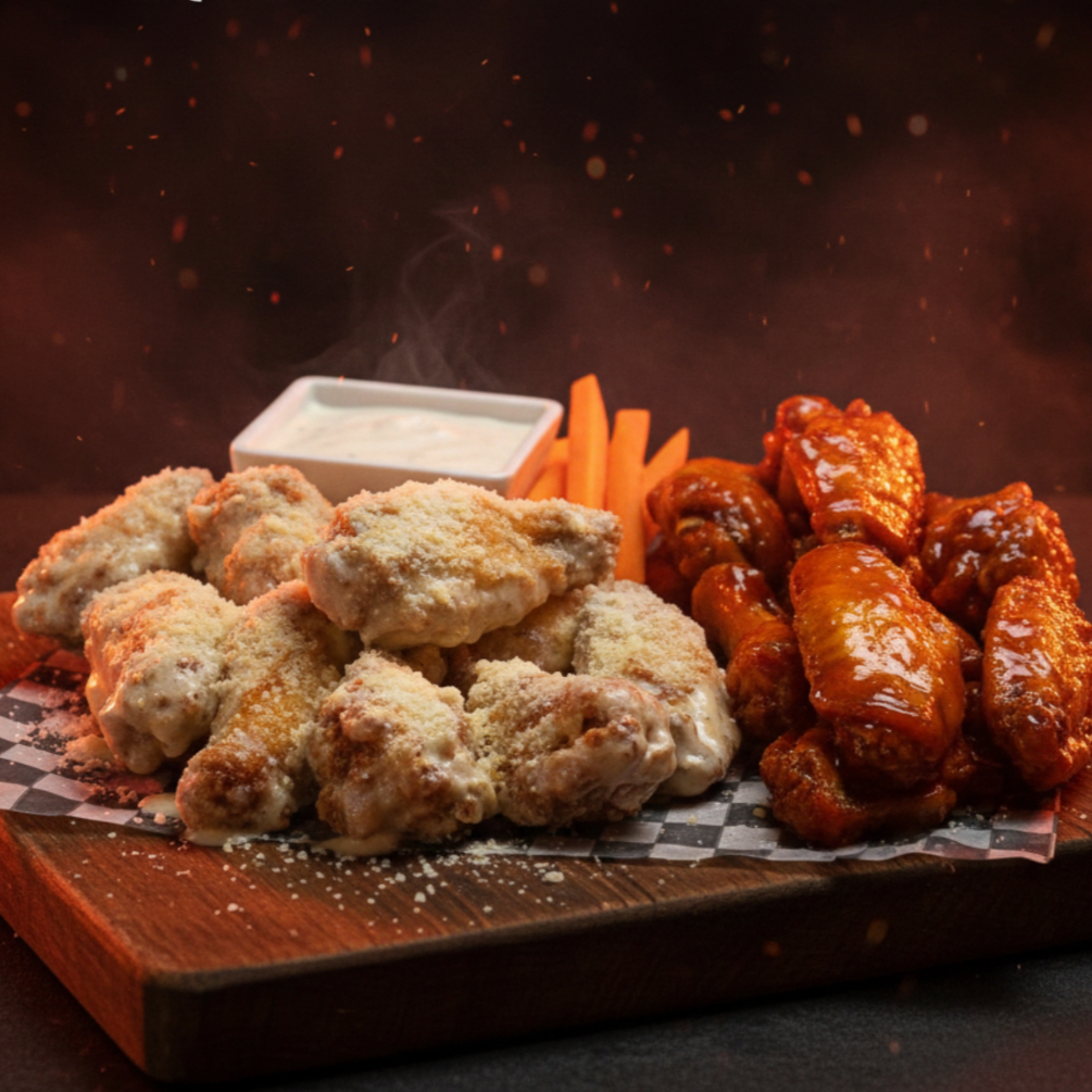 18 piezas de alitas, fritas y bañadas en tu salsa favorita, acompañada de bastones de apio y zanahoria.