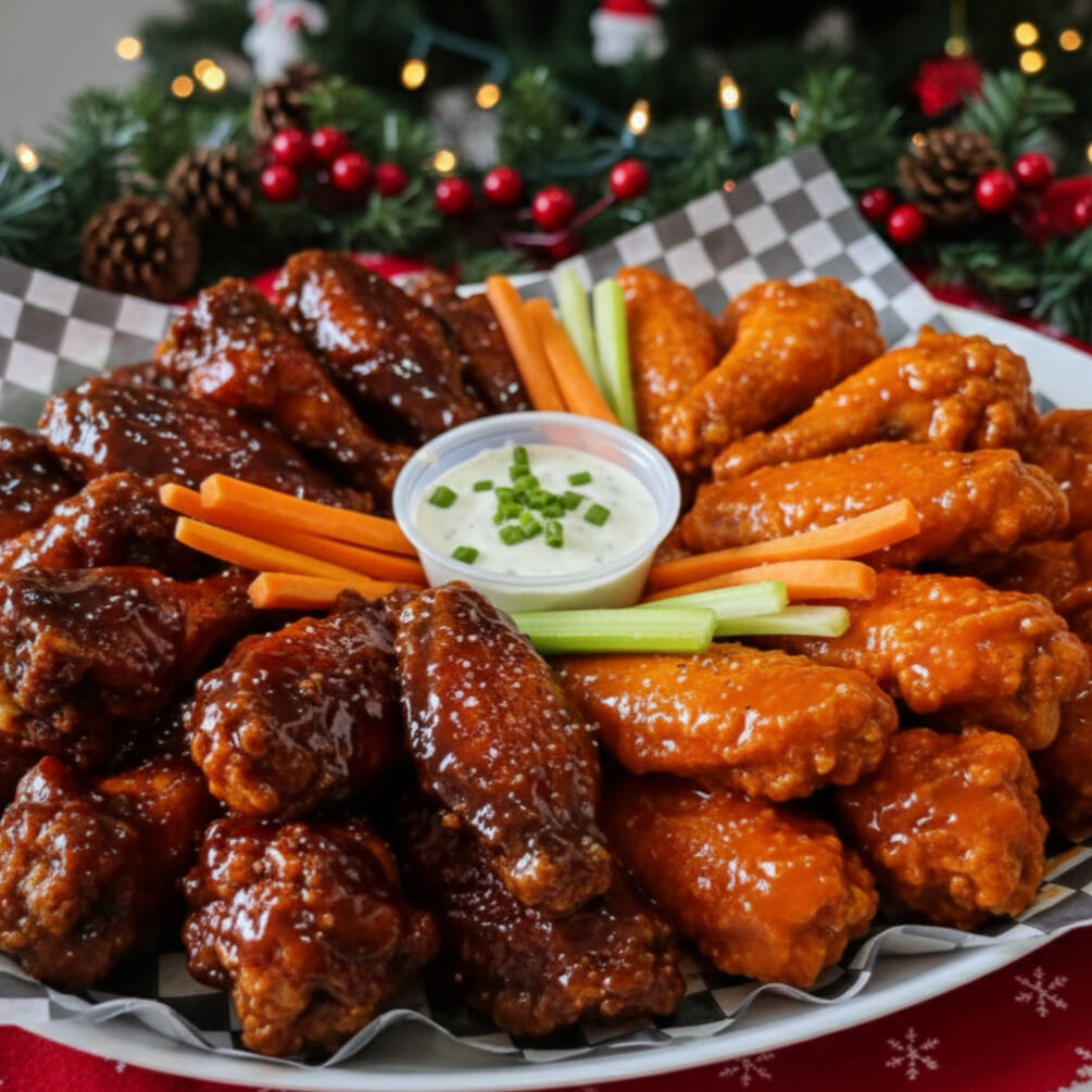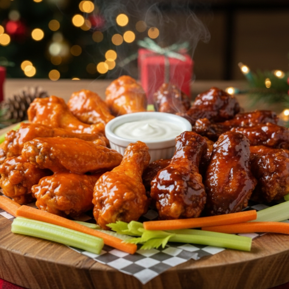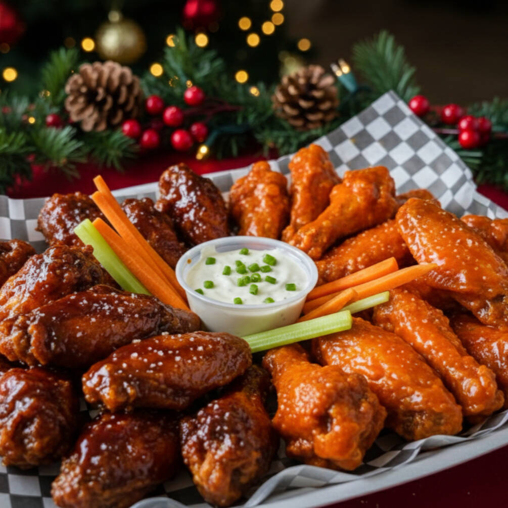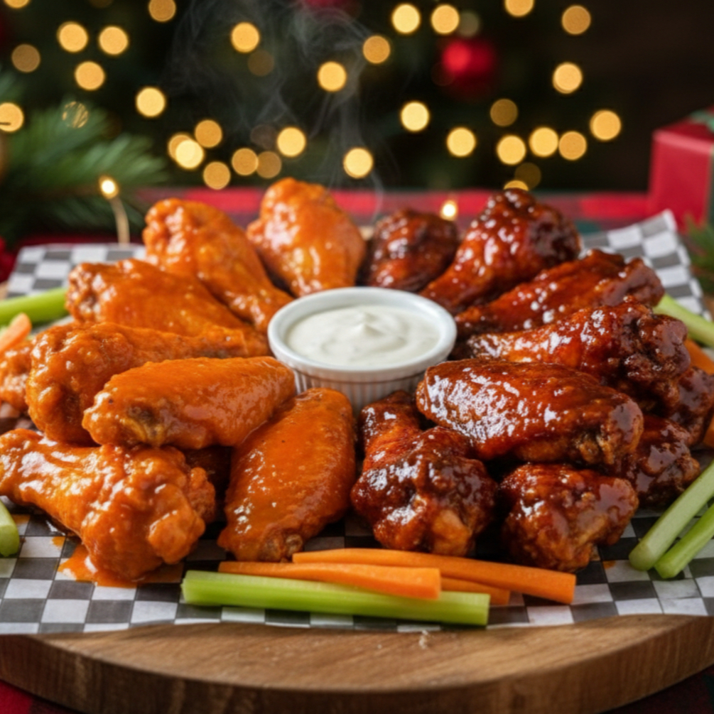 18 piezas de alitas, fritas y bañadas en tu salsa favorita, acompañada de bastones de apio y zanahoria.