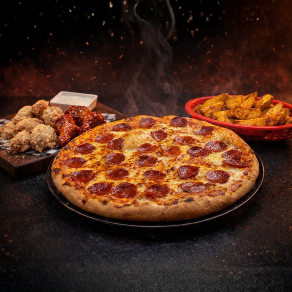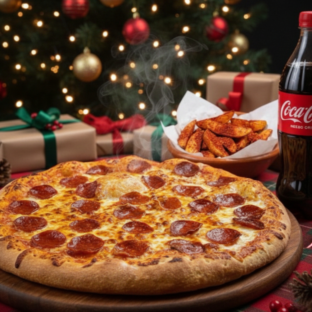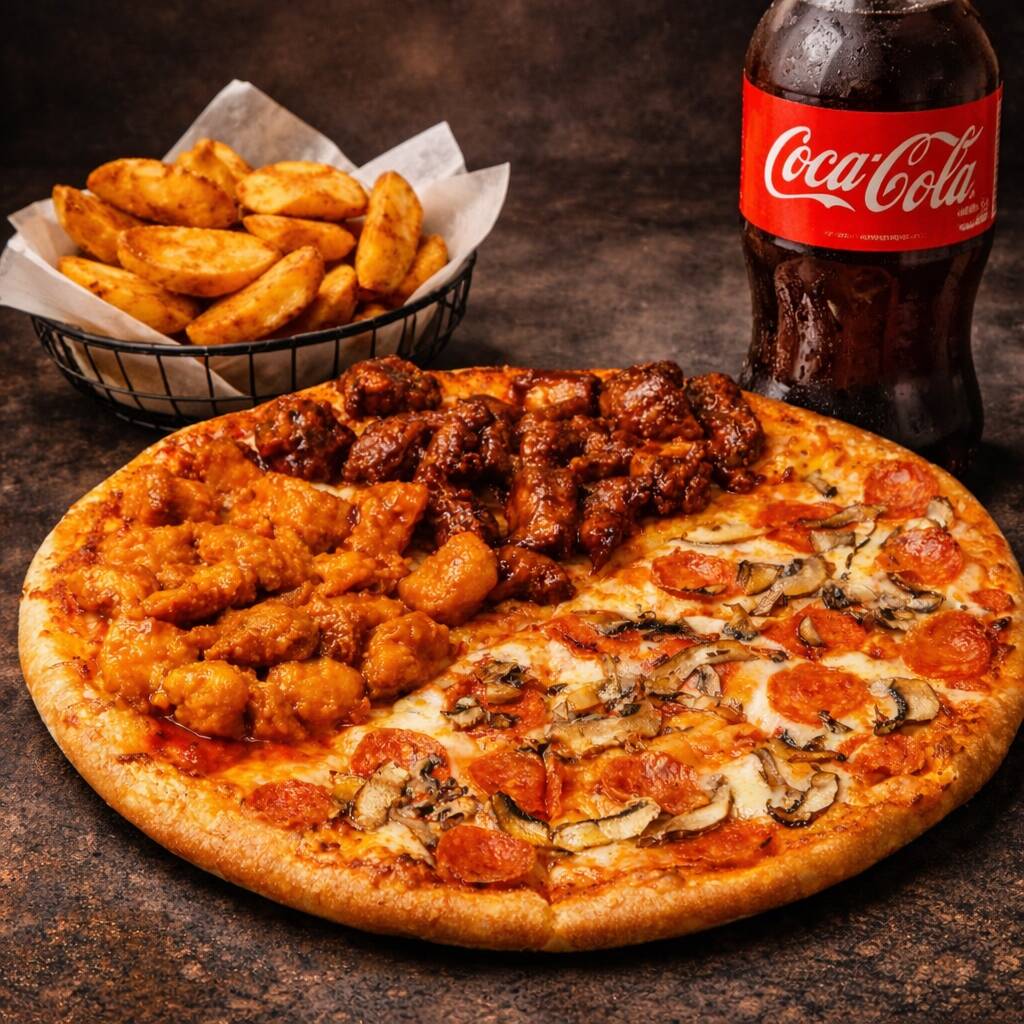 Pizza con 1/2 Kg Boneless*1 + Papas Gajo*1 + Coca Cola Sin Azúcar 1.35 Litros*1