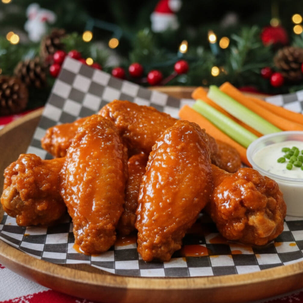 Alitas de pollo, empanizadas y fritas, bañadas en tu salsa favorita, acompañados de bastones de apio y zanahoria.
