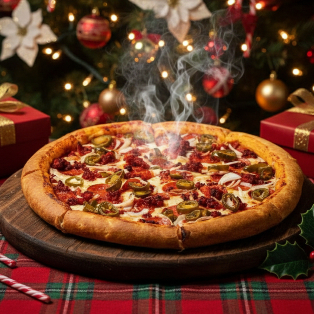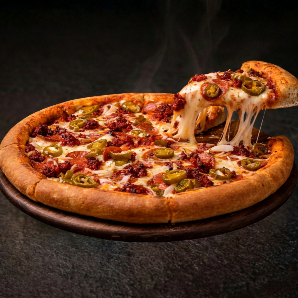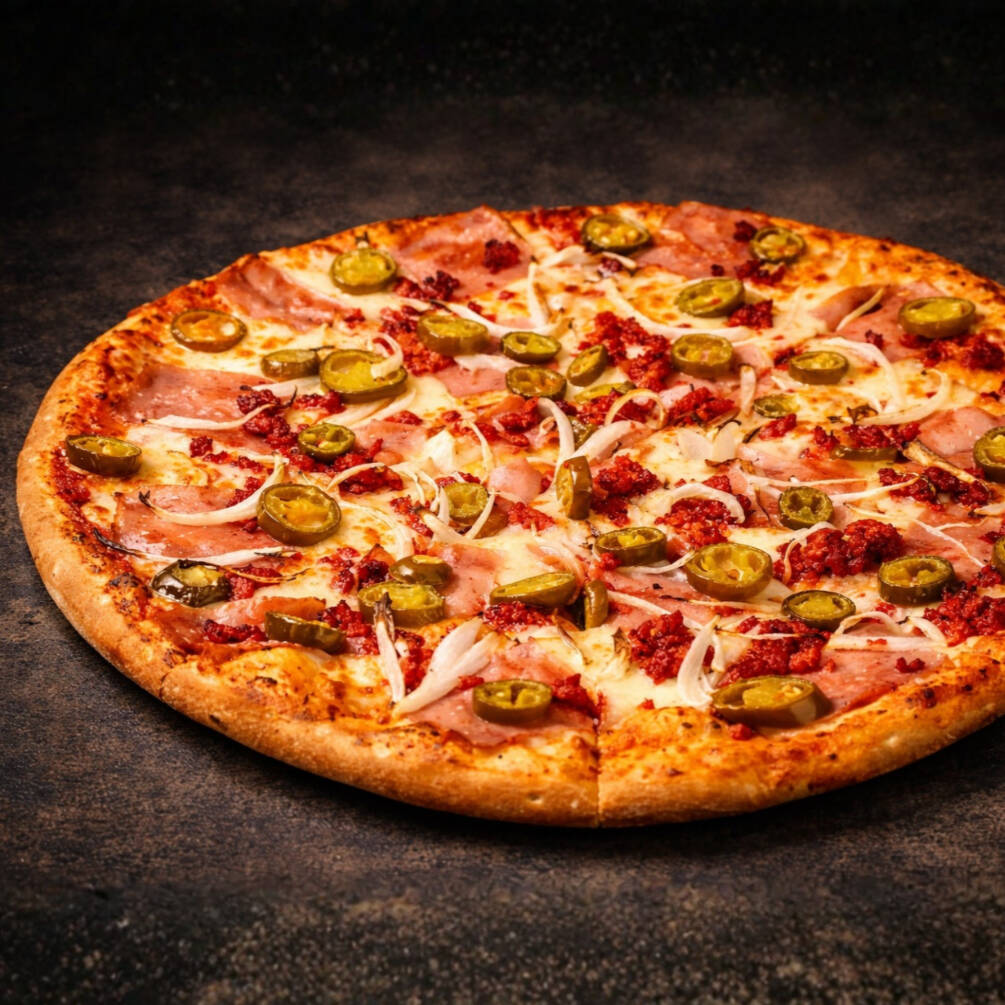Base tomate y queso, jamón, chorizo, cebolla y jalapeño.