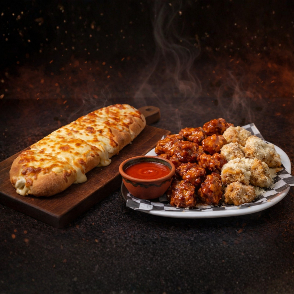 Base Tomate y queso, completa de deliciosos y crujientes Boneless, elige hasta 4 sabores de salsa
