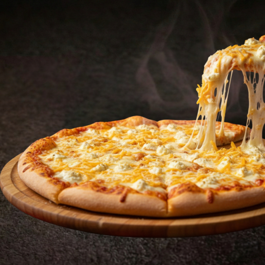 Pizza grande de 8 rebanadas, ingredientes: Queso Mozzarella, Cheddar, Parmesano y Philadelphia
