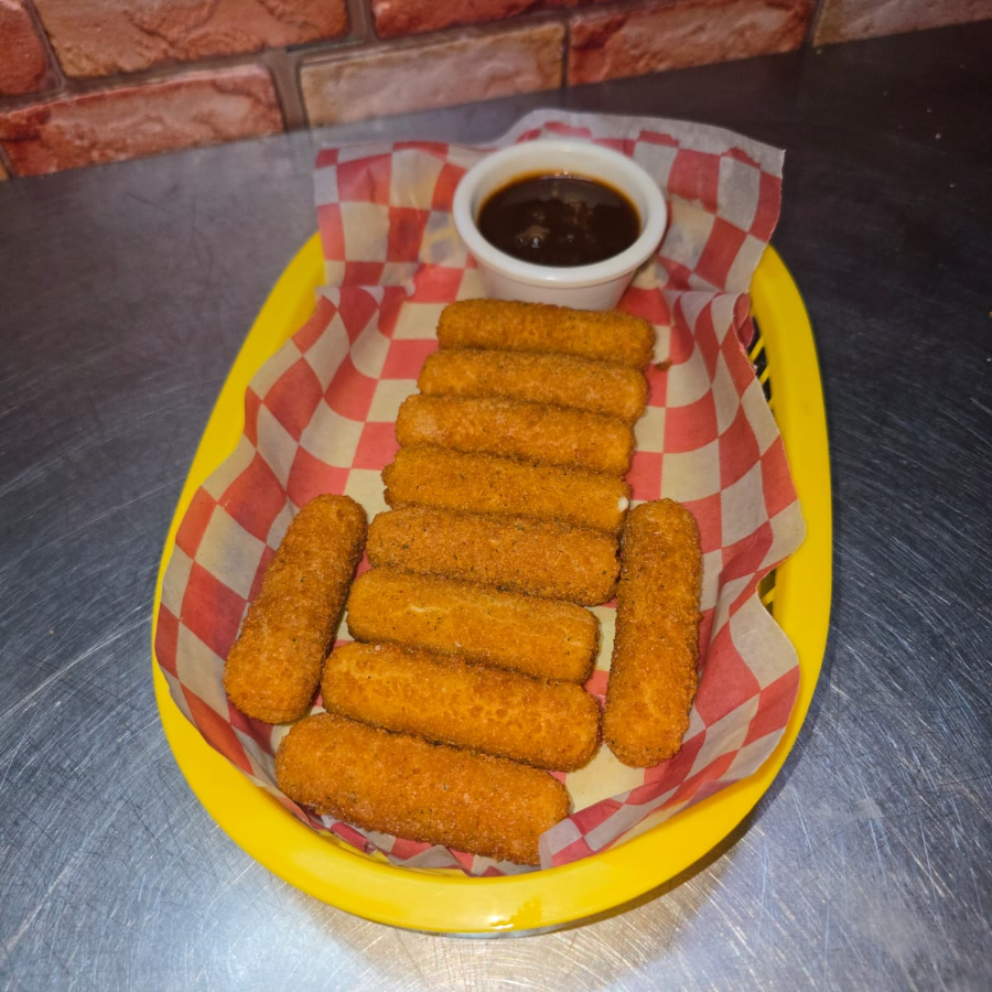 10 DEDOS DE QUESO ACOMPAÑADOS CON BBQ Y BLUE CHEESE