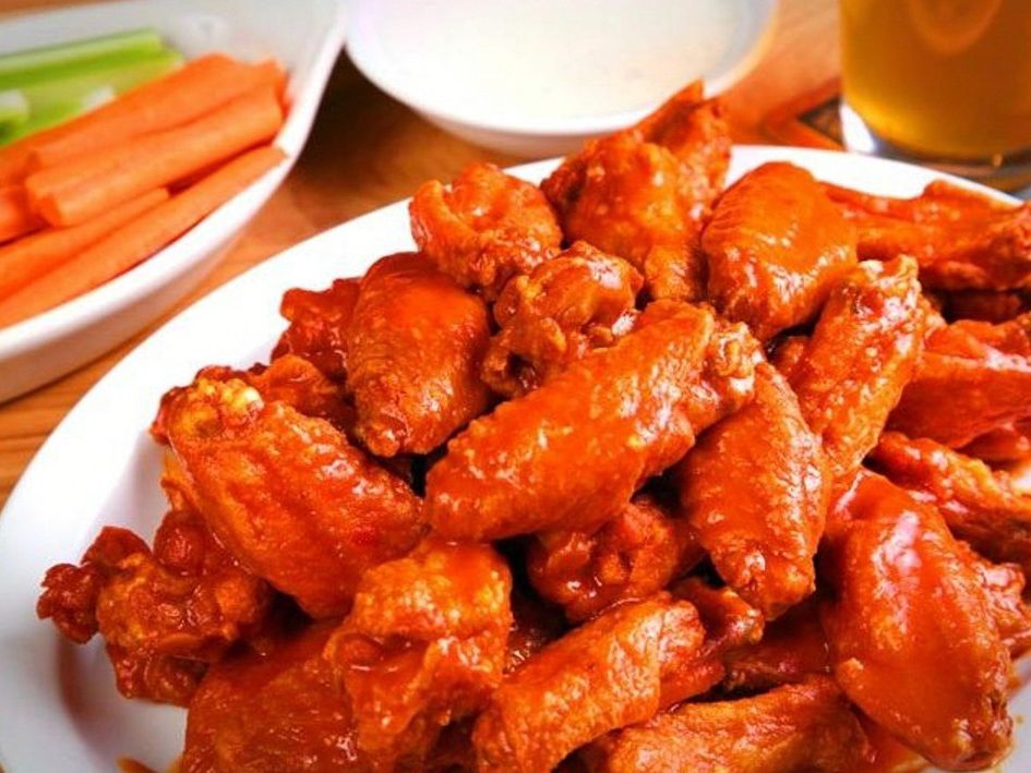 JUGOSAS TIRAS DE POLLO BAÑADAS EN SALSA BUFFALO SPICY ACOMPAÑADA DE FRESCOS VEGETALES QUESO AMERICANO TOCINO