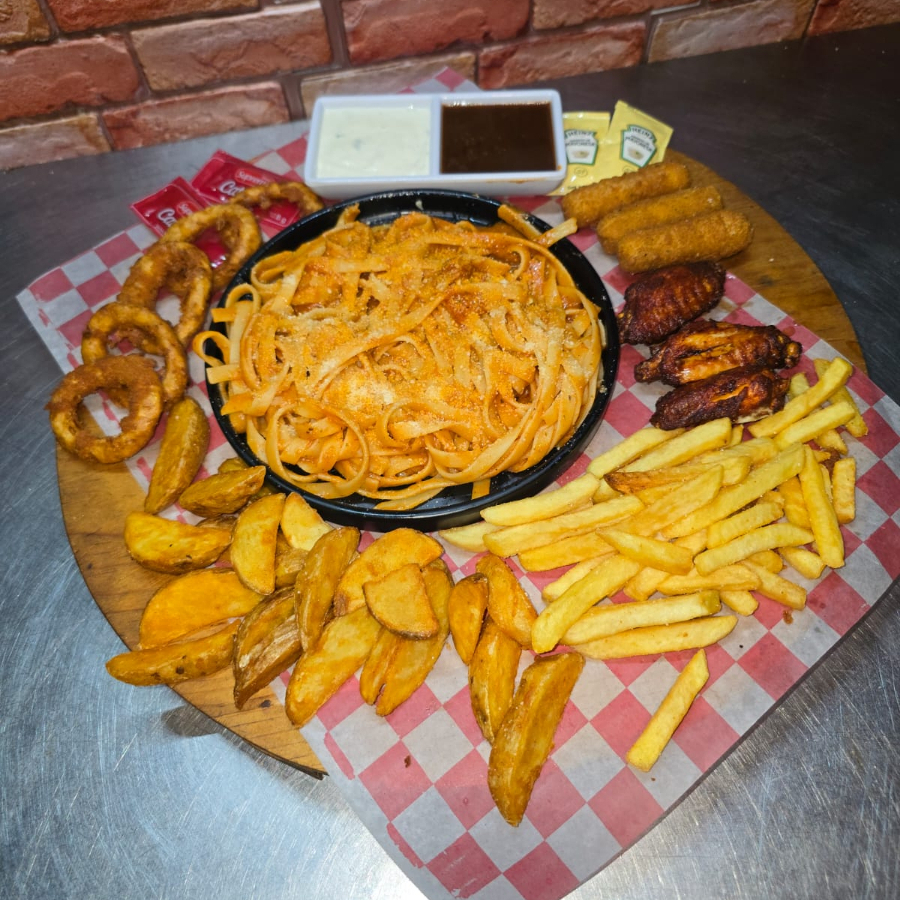 PARA 3 PERSONAS -COBINACION DE PAPAS GAJO Y FRANCESA, DEDOS DE QUESO, PASTA POMODORO, AROS DE CEBOLLA, ALITAS DE POLLO, Y DEDOS DE QUESO BLUE CHEESE Y BBQ Y BUFALO.