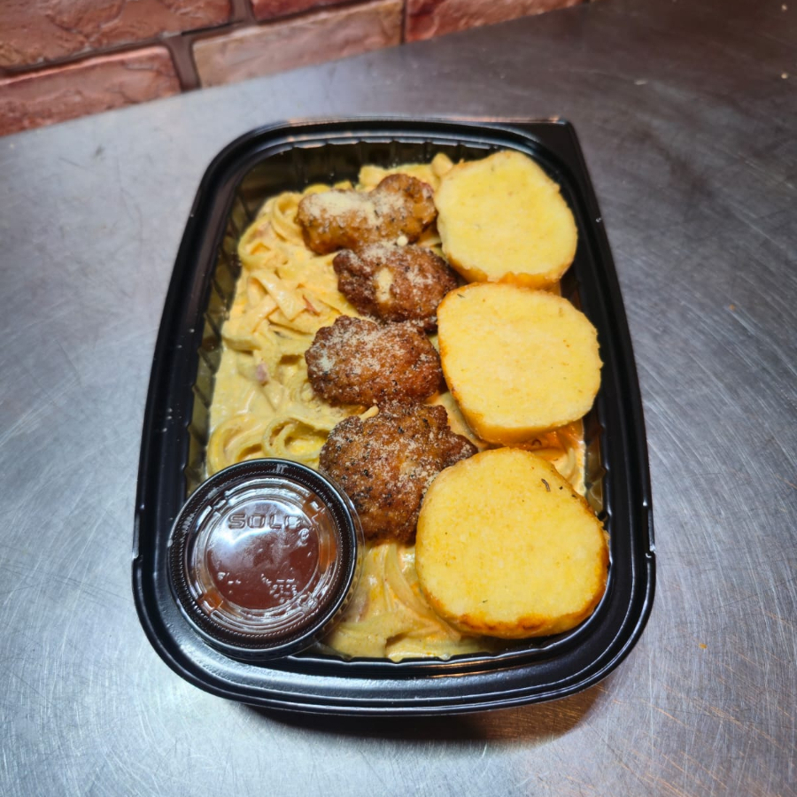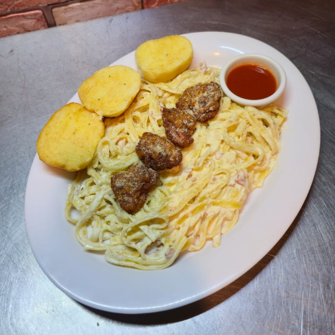 PARA 2 PERSONAS, DELICIOSA PASTA FETUCCINO ALFREDO CON SALSA CHIPOTLE BONELES DE POLLO Y 3 PAN DE AJO
