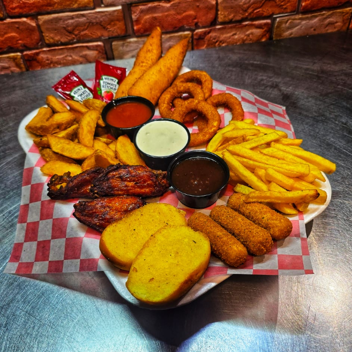 DELICIOSA CONBINACION DE DEDOS DE QUESO, AROS DE CEDBOLLA, ALITAS DE POLLO, TENDERS,BOLLITOS DE PAPA, PAPAS A LA FRANCESA, PAPAS GAJO Y BLUE CHEESE, BBQ, BUFALO Y KETCHUP PARA 2 PERSONAS