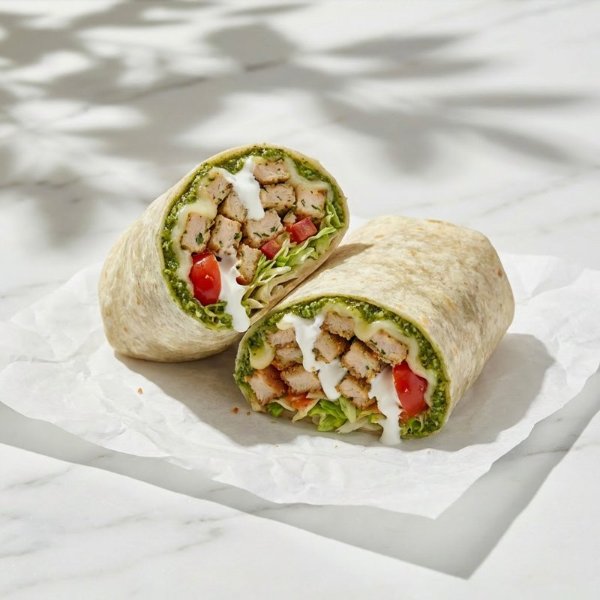 Wrap en tortilla de harina relleno con pollo pesto, queso mozzarella, jitomate, lechuga, crema y pesto.