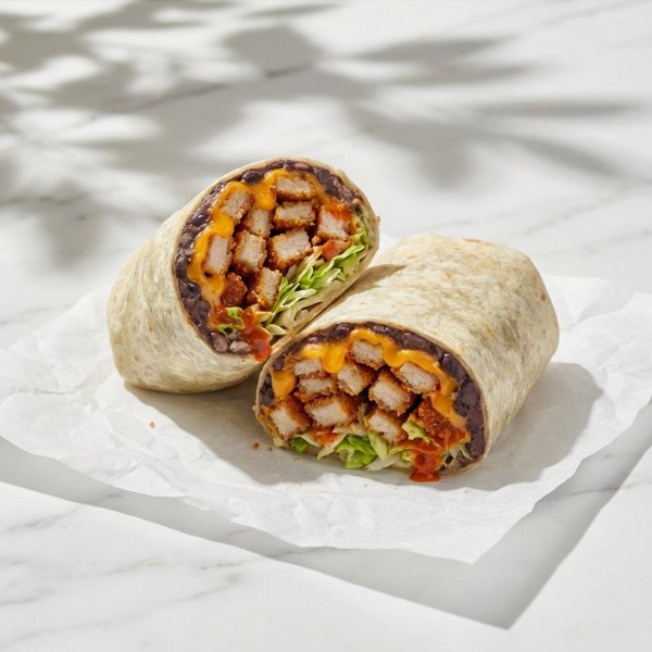 Wrap en tortilla de harina relleno con pollo empanizado, queso cheddar, fríjoles,lechuga y salsa buffalo.