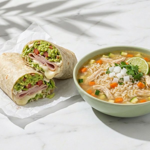 Combo que incluye una sopa del día y un wrap a elección, todo preparado con ingredientes frescos y de calidad.