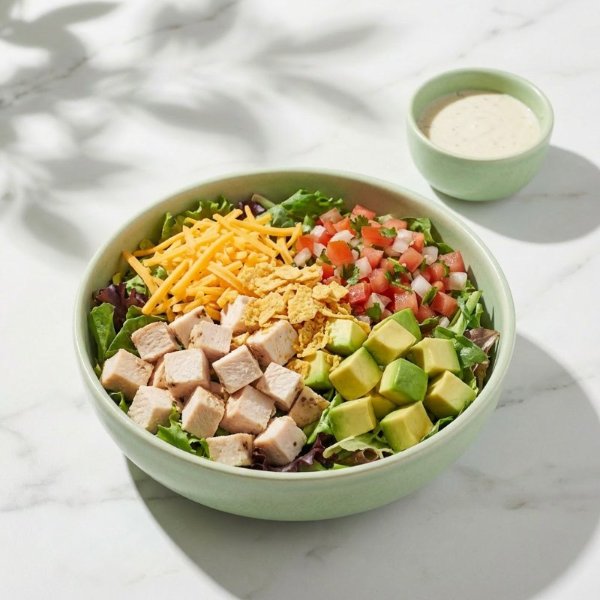 Ensalada a base de lechuga con pollo en cubos, queso cheddar, pico de gallo, aguacate, totopos triturados y aderezo a elección. El tamaño perfecto para que la acompañes con una sopa o wrap.
