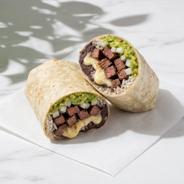 Tortilla de harina rellena de arrachera, queso mozzarella, frijoles, arroz blanco, guacamole y salsa de la casa.