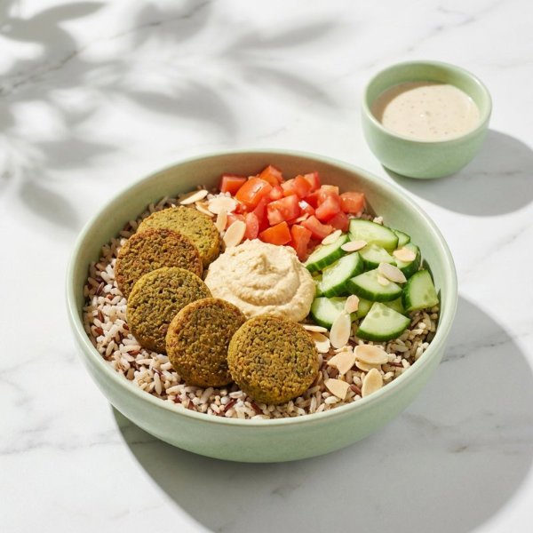 Bowl a base de arroz integral y almendras con falafel (5 unds), hummus de garbanzo, jitomate, pepino, perejil y vinagreta a elección. El tamaño perfecto para que lo acompañes con una sopa o wrap.