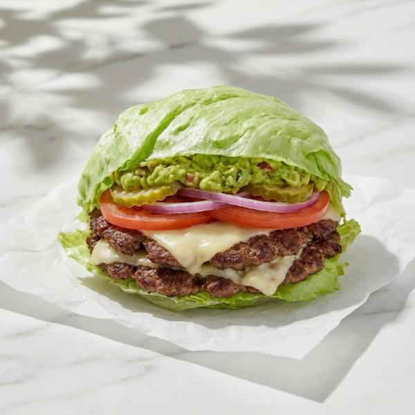 Wrap en hojas de lechuga relleno con 180gr de carne smashed de hamburguesa, queso mozzarella, jitomate, cebolla, pepinillos y guacamole.