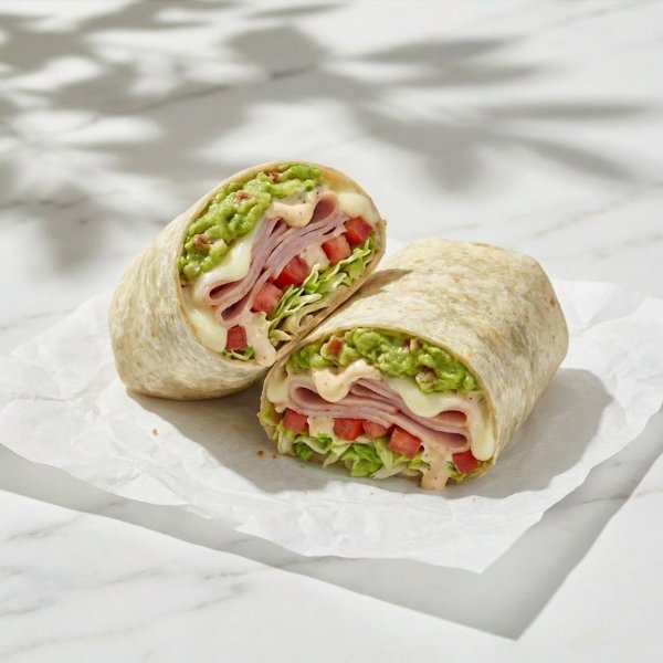 Wrap en tortilla de harina relleno con jamón de pavo, queso mozzarella, lechuga, jitomate, guacamole y alioli.