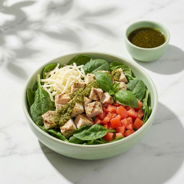 Ensalada a base de lechuga con pollo pesto, queso mozzarella, jitomate, albahaca y aderezo a elección. El tamaño perfecto para que la acompañes con una sopa o wrap.