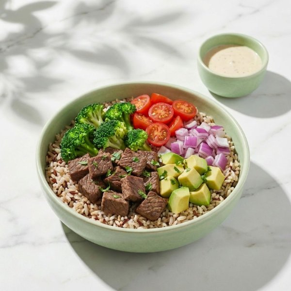 Bowl a base de arroz integral con arrachera, brócoli, tomate cherry, cebolla morada, aguacate, cilantro y vinagreta a elección. El tamaño perfecto para que lo acompañes con tu sopa o wrap favorito.