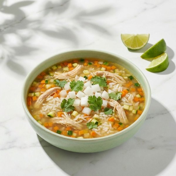 Consome con pechuga de pollo (32g.), arroz, zanahoria y zucchini, acompañado con cebolla, cilantro y limón.