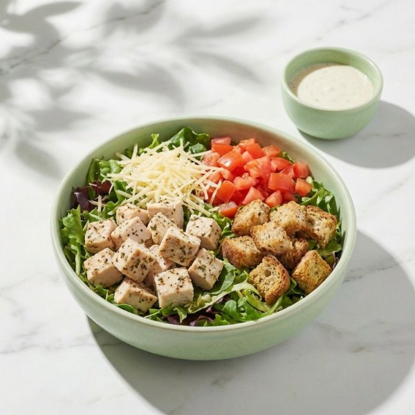 Ensalada a base de lechuga con pollo pesto, queso parmesano, jitomate, crutones y aderezo a elección. El tamaño perfecto para que la acompañes con una sopa o wrap.