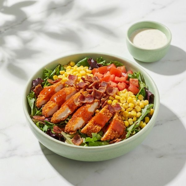 Ensalada a base de lechuga con pollo empanizado en salsa Buffalo, tocino, maíz dulce, jitomate y aderezo a elección. El tamaño perfecto para que la acompañes con una sopa o wrap.