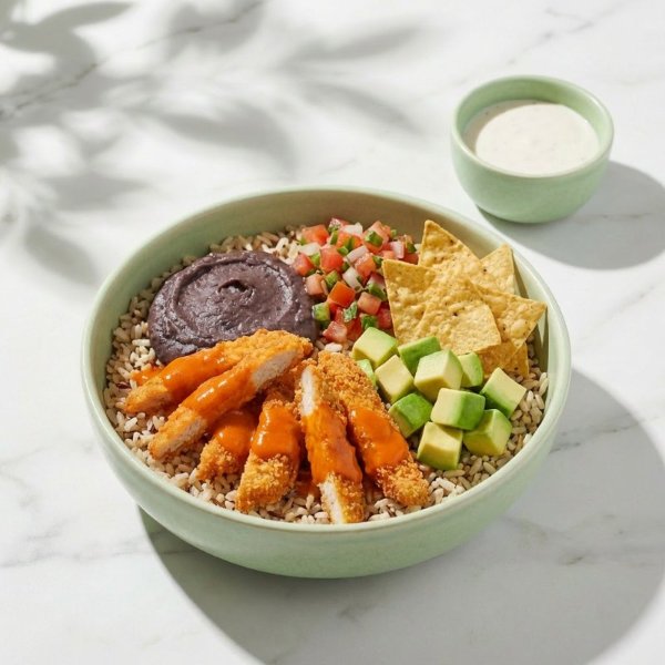 Bowl a base de arroz integral con pollo empanizado, fríjoles refritos, pico de gallo, aguacate, totopos y vinagreta a elección. El tamaño perfecto para que lo acompañes con una sopa o wrap.