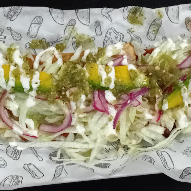 Romanita , cebolla ,salsa de tomate verde ,aguacate , media crema y queso sopero.