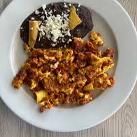 Huevos revueltos con tomate, cebolla y chile serrano.