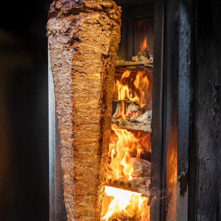 1 Kg de döner kebab de carne de res, servido con cebolla y cilantro, crema de ajo y tortillas.