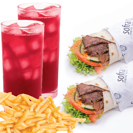 Tortilla (turca) de harina hecho en casa sofra con kebab de res, ensalada turca (dentro del durum), salsa sofra de ajo, papas a la francesa, el combo incluye 2 durums + 2 bebidas + 2 papas a la francesa. puedes pedir que se hace el cambio de cualquer durum en lugar de kebab, puede ser pollo turco o kofte. porfavor avisanos si quieres hacer el cambio.
