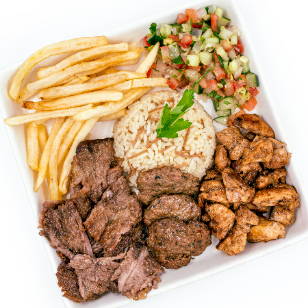Kebab de res, pollo marinado estilo turco, köfte, arroz turco con mantequilla, papas a la francesa y ensalada, para una persona.