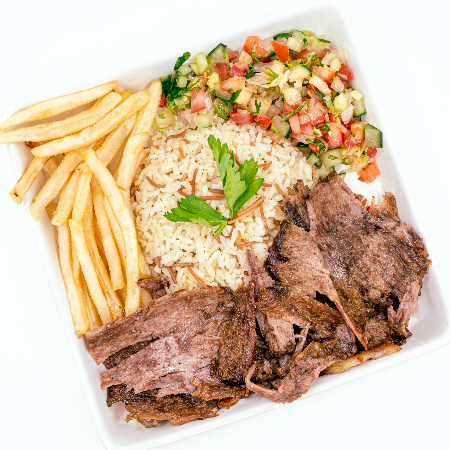 Kebab de res, arroz turco con mantequilla acompañado con papas a la francesa y ensalada turca.