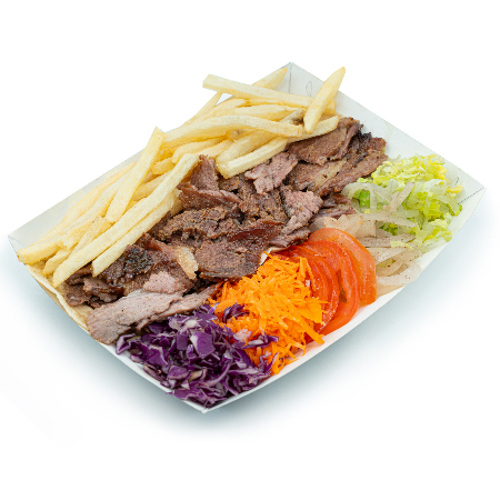 4 Tortillas de harina hecho a mano, salsa sofra, döner kebab, papas a la francesa, ensalada.